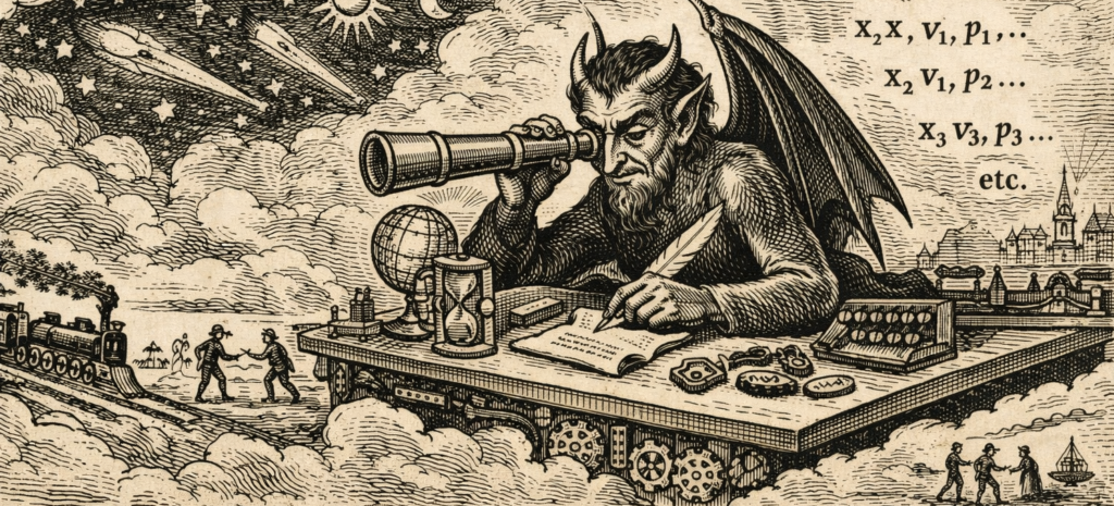 Imagine uma inteligência capaz de conhecer exatamente a posição e a velocidade de todas as partículas do universo em um dado instante, além de compreender perfeitamente todas as leis da natureza. Com essas informações, essa inteligência poderia calcular tanto o passado quanto o futuro do universo com total precisão. Como se acompanhasse a queda de uma fileira de peças de dominós que, por obedecer leis conhecidas de conservação de energia da física clássica, permitiria que, por meio delas se reconstituísse, a partir de qualquer ponto da cadeia, a origem do movimento (seu passado) ou para onde ela tende (seu futuro).
